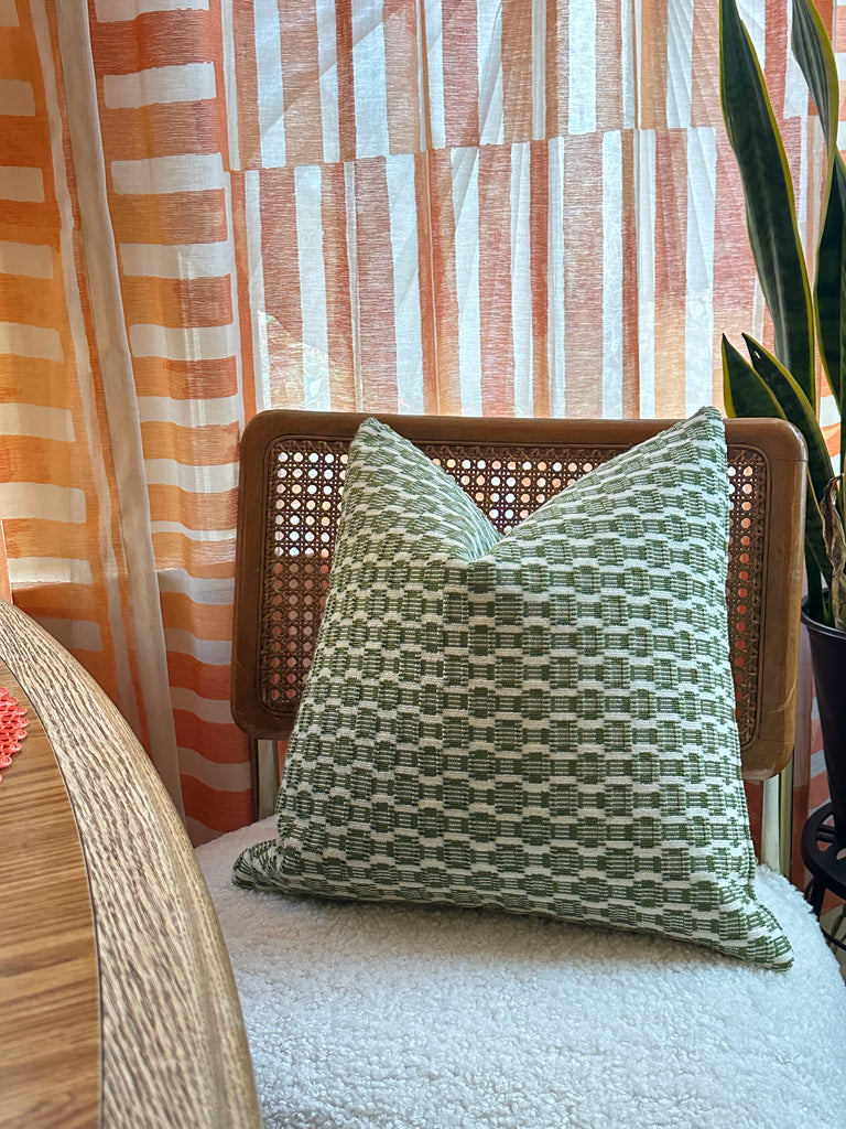 “Rhoda” is a beautiful Velvet Épinglé pillow cover, with a small scale Fern Green and Ivory checked pattern. Size pictured is 18x18. Épinglé velvet features a unique texture that is created during the weaving process on a wire loom, combining both looped and cut velvet within the same fabric.