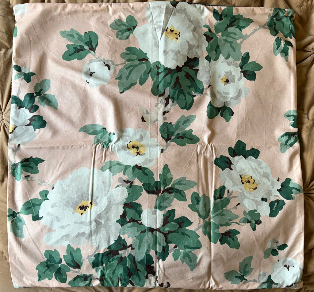 Sale! Peach and Green Floral Chintz pillow cover, size approximately 24x24” with solid dark green back and invisible zipper. Steam the creases out and it’s good to go!