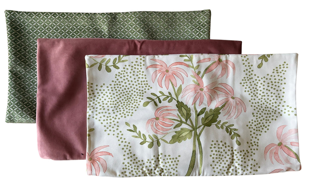 Offered is a Set of three 12x21 Pillow Covers, one floral, one blush velvet, and one sage green diamond velvet (Sage velvet was made reversible).