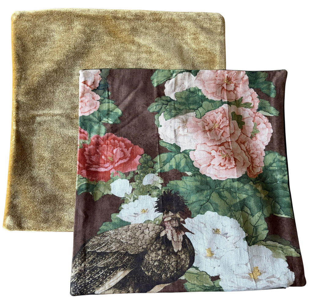Offered is a Set of Two Pillow Covers- Schumacher Floral Chickens & Gold Mohair, finished with invisible zipper closures. Size is approximately 15.5”-16x16” square.
